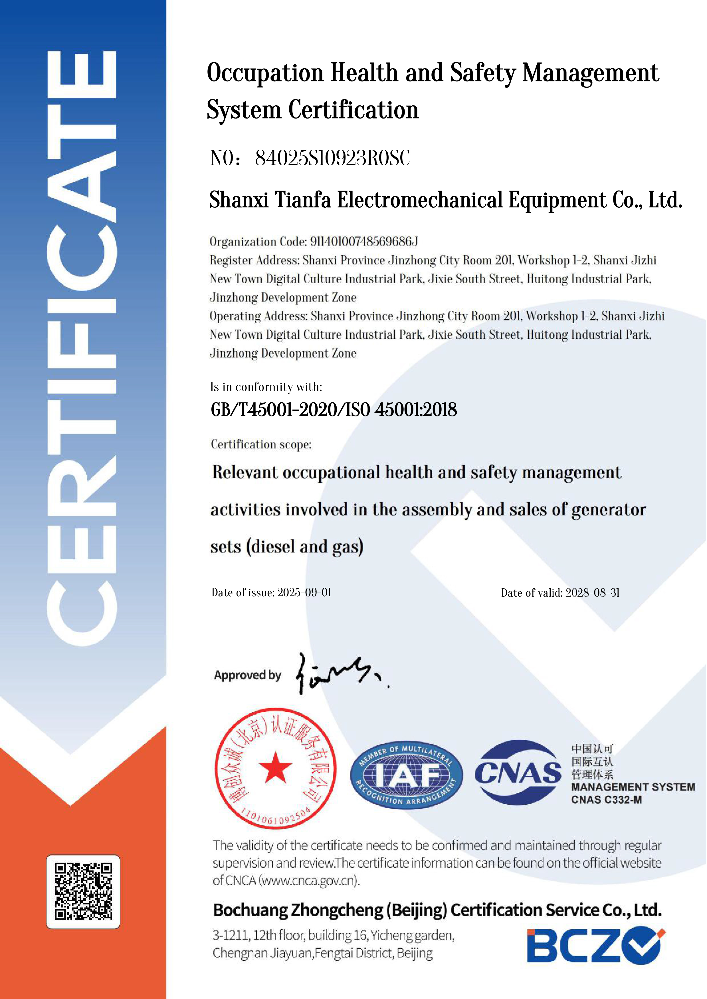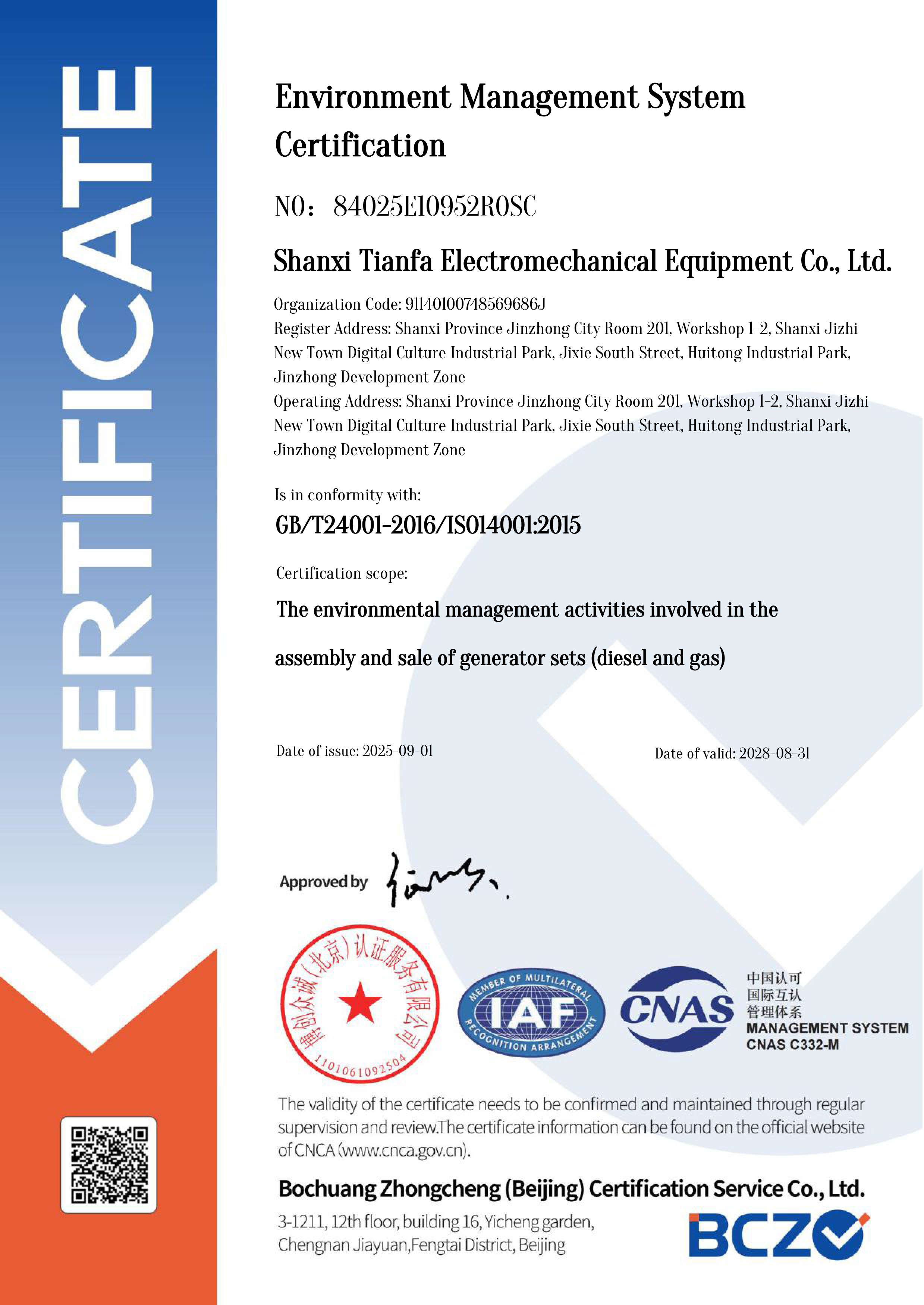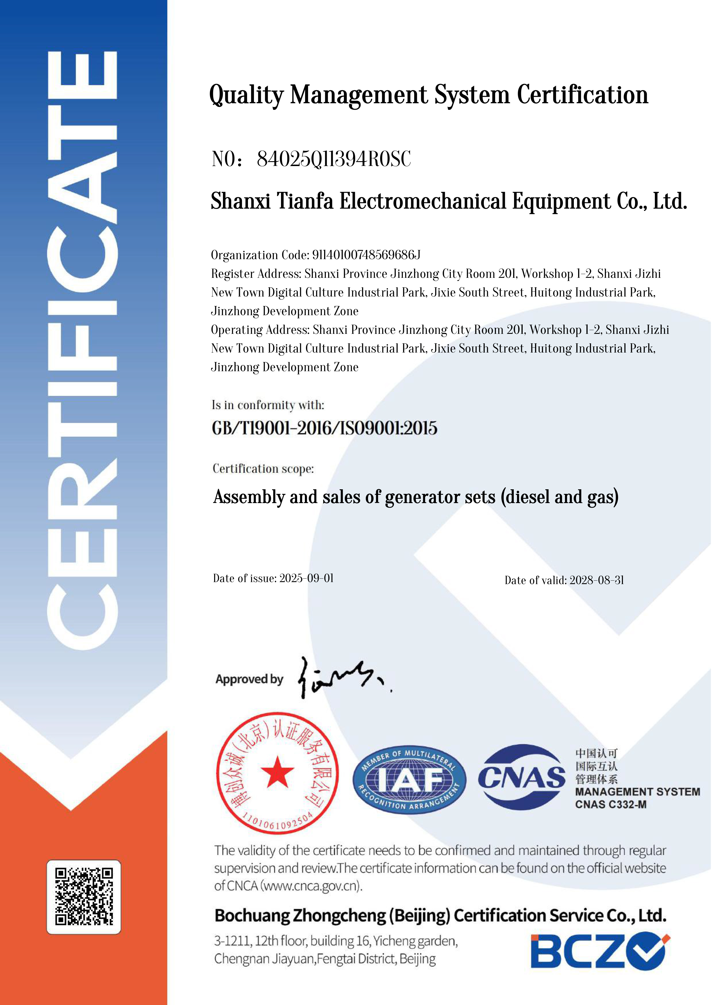Shanxi Tianfa Electromechanical Equipment Co., Ltd.was established in 2003.It has a factory building area of over 13,000 square meters and an annual output value of over 80 million yuan.Our company has more than 150 employees, including 15 technical and design engineers, among whom 6 are senior engineers. It is a large-scale enterprise specializing in the manufacturing, sales, leasing, operation and maintenance of diesel and gas generator sets.Our products have been exported to many countries and regions such as Africa, Kazakhstan and the Middle East.Our product range is comprehensive, quality is guaranteed, and they are suitable for industrial and agricultural production, infrastructure, scientific and technological fields, and daily life. Our company's services: We offer a wide variety of specifications and brands,effective OEM/ODM service, excellent quality management, competitive prices, and a professional team of technical engineers.